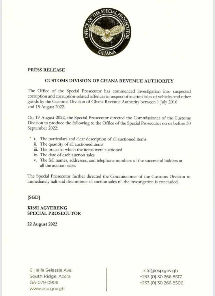The Special Prosecutor has commenced a full-scale investigation into suspected corruption and corruption-related offences in respect of auction sales of vehicles and goods by the customs divisions of the Ghana Revenue Authority between July 1, 2017, to August 15, 2022.