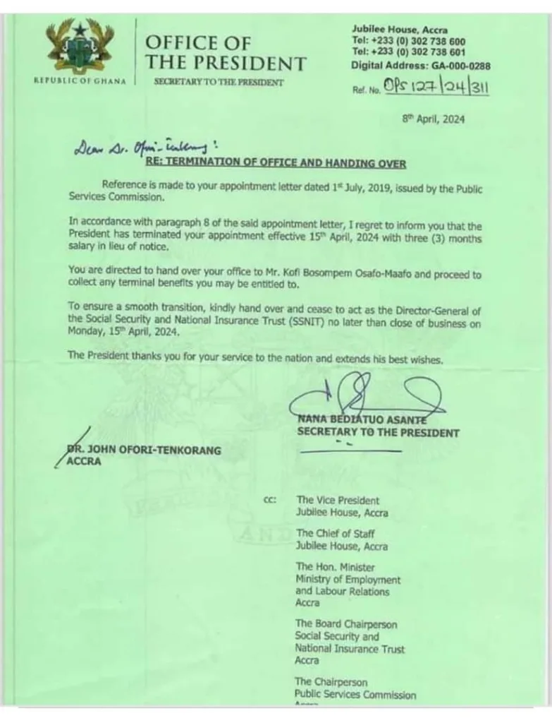 President Akufo-Addo has terminated the appointment of the Director-General of the Social Security and National Insurance Trust (SSNIT), Dr. John Ofori Tenkorang.