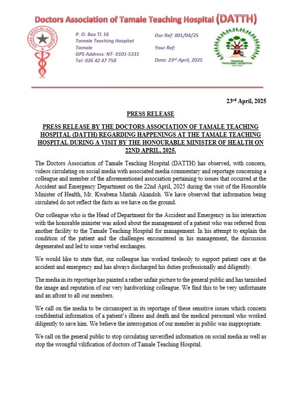 The Doctors Association of Tamale Teaching Hospital (DATTH) has issued a strong statement in response to recent events during the Health Minister’s visit to the facility on April 22, 2025.