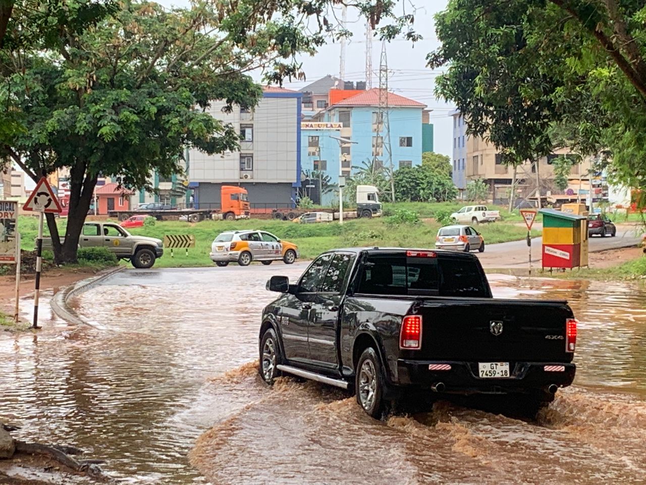 The main road at the back of the Tema Polyclinic is also flooded causing drivers to turn the other side of the road into a double road, facing oncoming traffic.