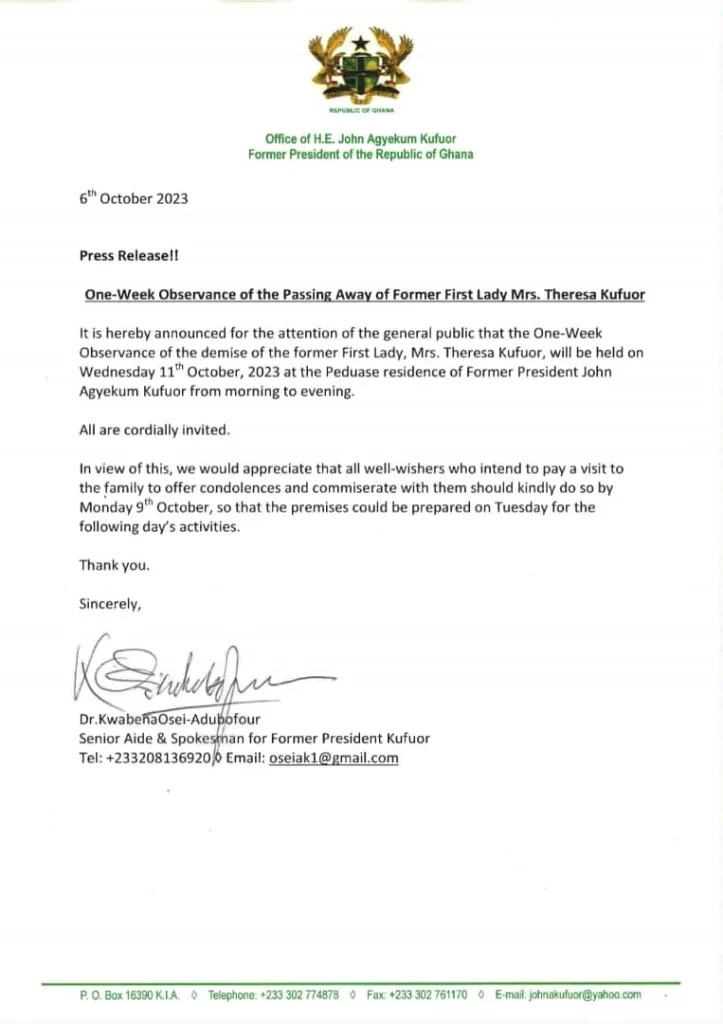 The Office of former President John Agyekum Kufuor has announced the one-week observance following the death of his late wife, Theresa Kufuor.