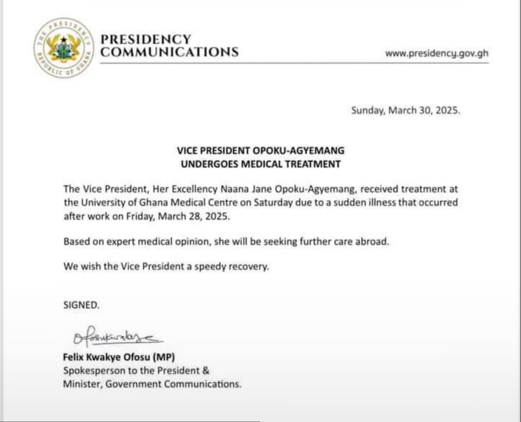 The Vice President of Ghana, Naana Jane Opoku-Agyemang, has received medical treatment at the University of Ghana Medical Centre following a sudden illness on Friday, March 28, 2025.