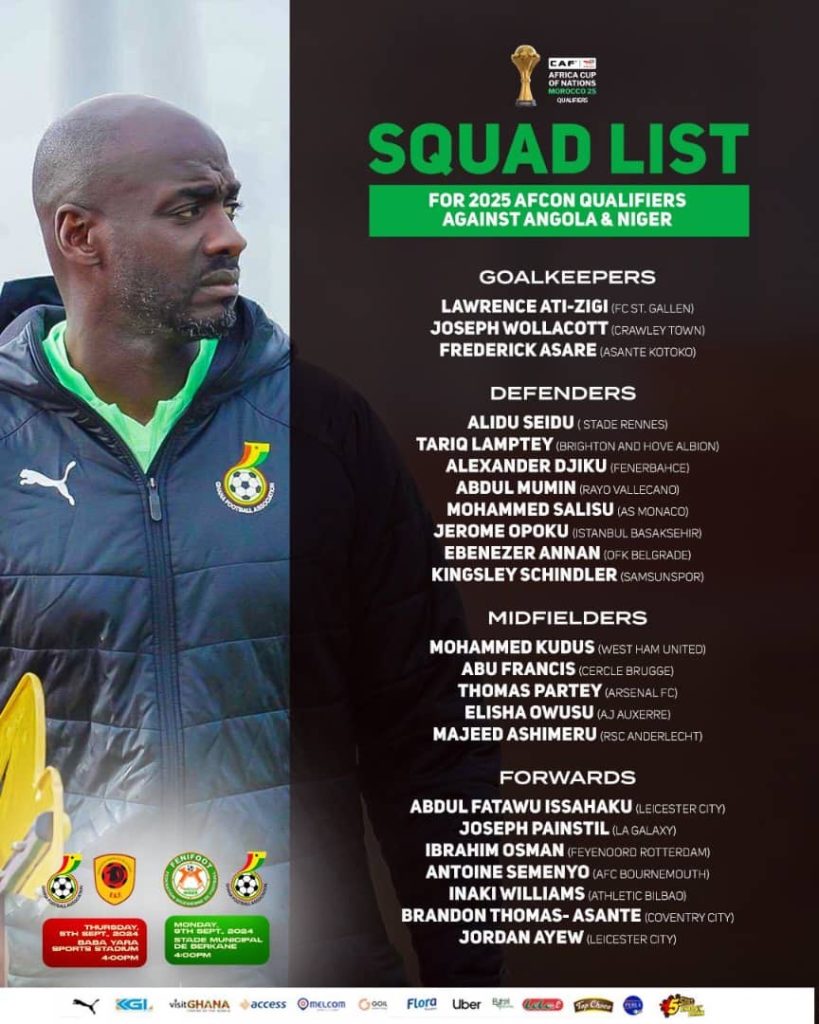 The selection includes a mix of seasoned players and promising talents, aimed at securing Ghana’s spot in AFCON 2025.