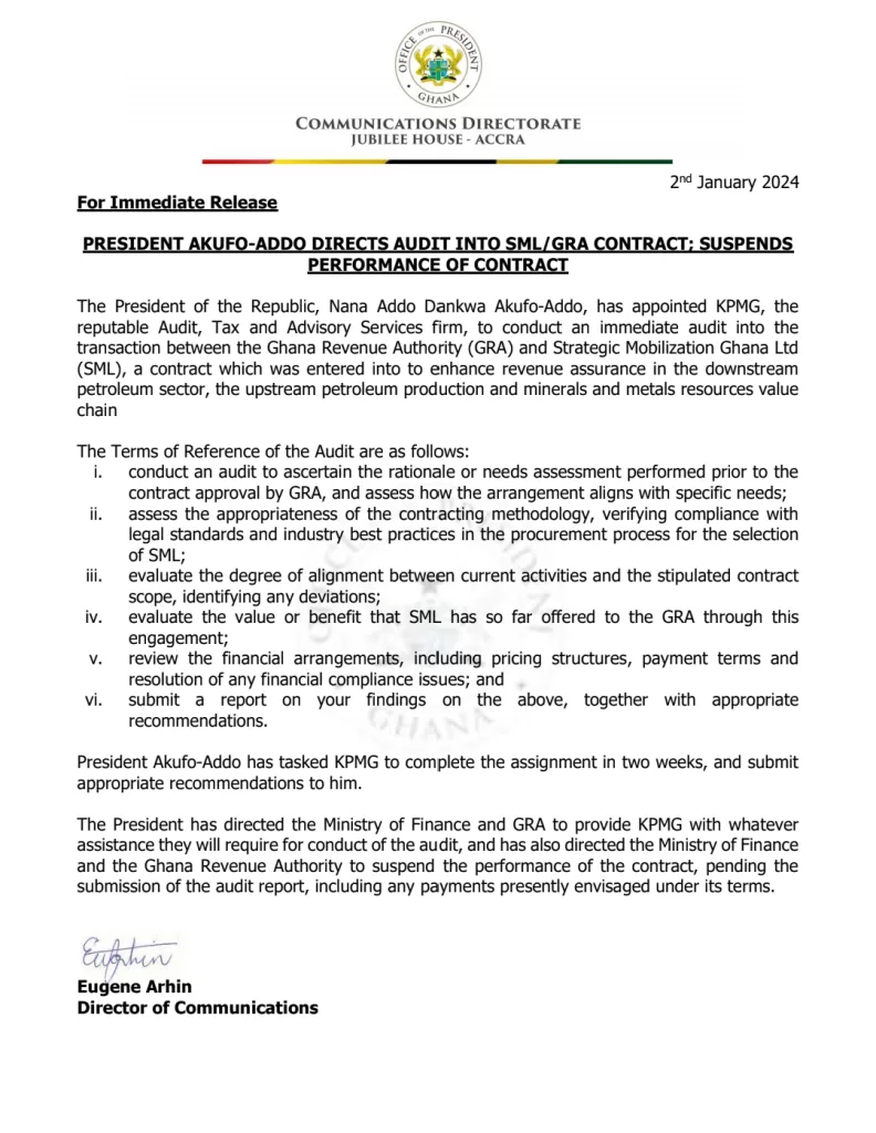 A press release dated January 2, 2024 and signed by the Director of Communication at the Presidency, Eugene Arhin stated that the Terms of Reference of the audit are as follows: “i conduct an audit to ascertain the rationale or needs assessment performed before the contract approval by GRA, and assess how the arrangement aligns with specific needs; ii. assess the appropriateness of the contracting methodology, verifying compliance with legal standards and industry best practices in the procurement process for the selection of SML;