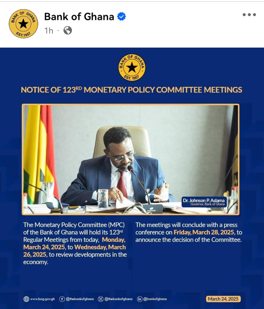 The Bank of Ghana’s Monetary Policy Committee (MPC) will hold its 123rd Regular Meetings starting today, Monday, March 24, 2025.