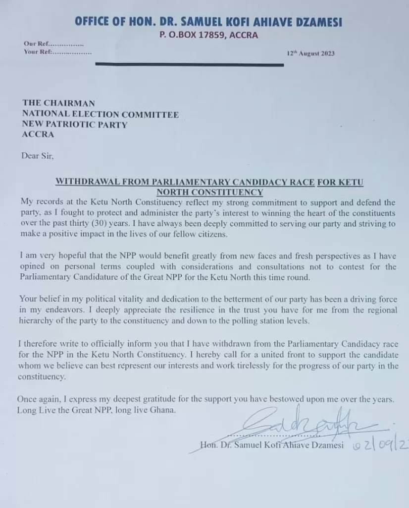 “I therefore write to officially inform you that I have withdrawn from the Parliamentary Candidacy race for the NPP in the Ketu North Constituency. I hereby call for a united front to support the candidate whom we believe can best represent our interests and work tirelessly for the progress of our party in the constituency,” portion of the letter stated.