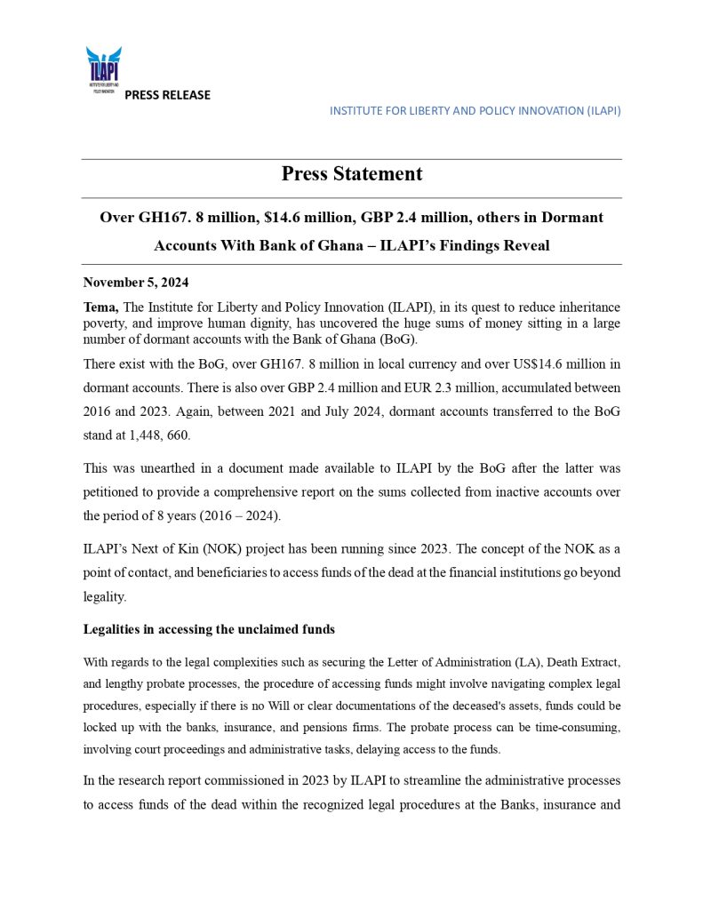 The Institute for Liberty and Policy Innovation (ILAPI), in its mission to reduce inheritance poverty and improve human dignity, has uncovered significant sums of money in dormant accounts with the Bank of Ghana (BoG). According to ILAPI’s findings, these accounts hold over GH₵167.8 million, $14.6 million, GBP 2.4 million, and EUR 2.3 million, accumulated between 2016 and 2023. Additionally, between 2021 and July 2024, 1,448,660 dormant accounts were transferred to the BoG.