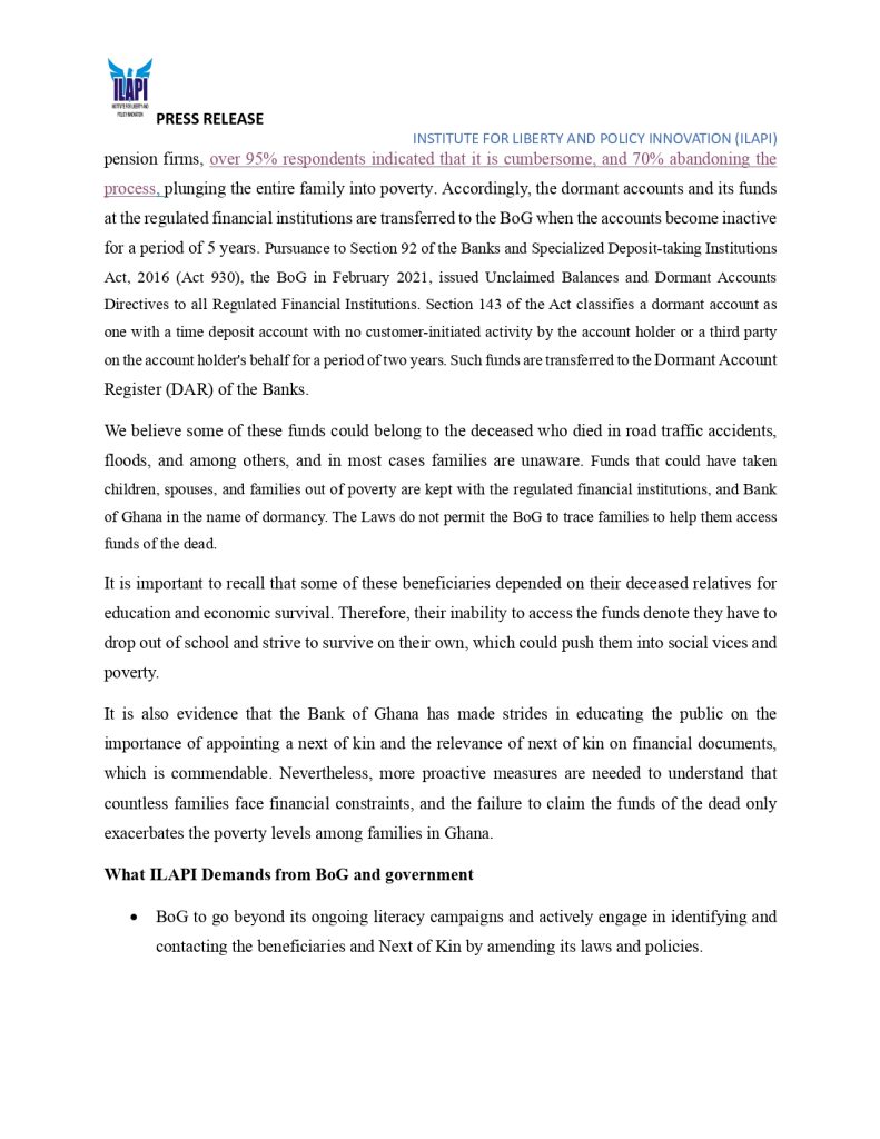 While acknowledging the BoG’s efforts in educating the public on appointing a next of kin, ILAPI emphasizes the need for more proactive measures to alleviate economic challenges faced by families unknowingly eligible for these funds. The BoG must demonstrate leadership and ethical stewardship to ensure economic prosperity and human dignity.