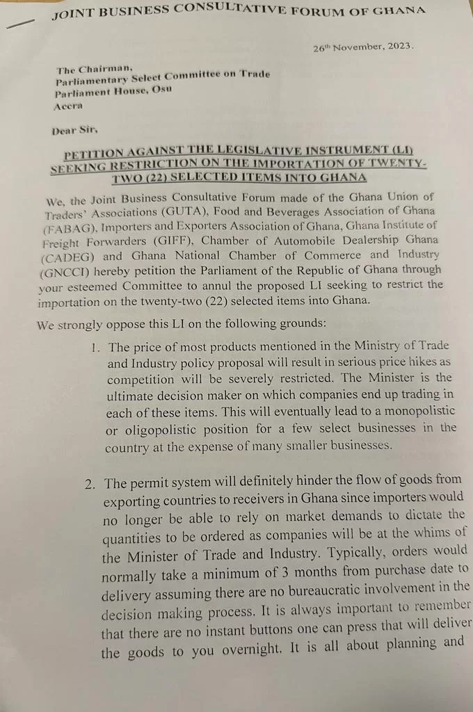 The Ghana Union of Traders Associations (GUTA), Food and Beverages Association of Ghana (FABAG), Importers and Exporters Association of Ghana (IEAG), Ghana Institute of Freight Forwarders (GIFF), Chamber of Automobile Dealership Ghana (CADEG), and Ghana National Chamber of Commerce and Industry (GNCCI), dubbed the Joint Business Consultative Forum, have petitioned the Parliament of Ghana over a proposed Import Restrictions Bill which is to laid before the House by the Trade and Industry Minister.