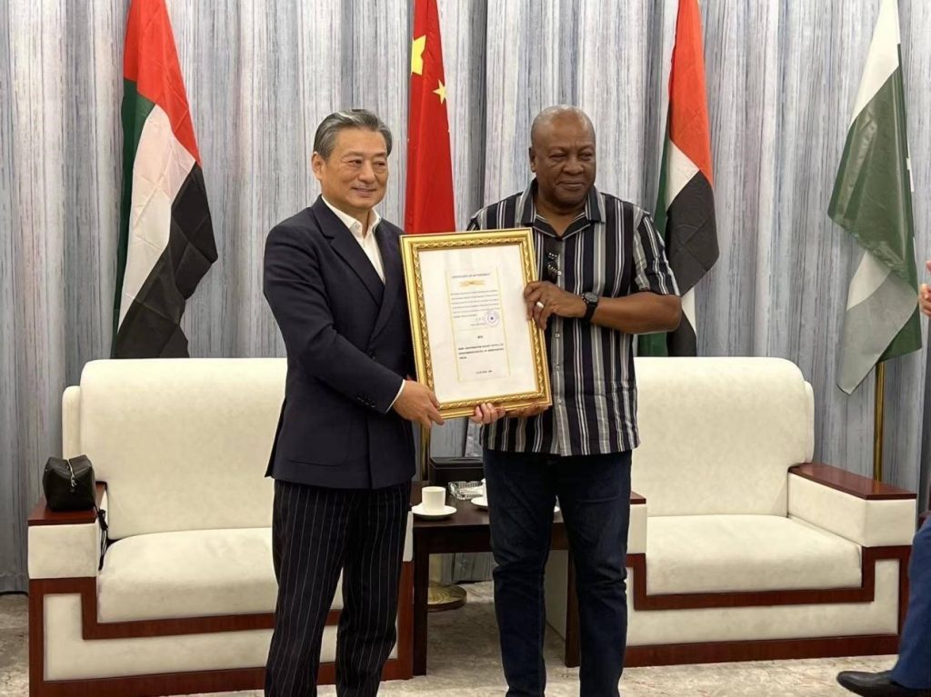 Additionally, Jiangsu Pacific Monocle Pharmaceutical Group entrusted the delegation to donate pharmaceuticals valued at US$1 million to the Ghanaian Elderly Security Fund (primarily for treating targeted ailments). President Mahama expressed profound gratitude for this contribution.