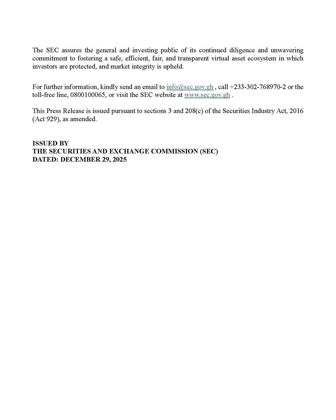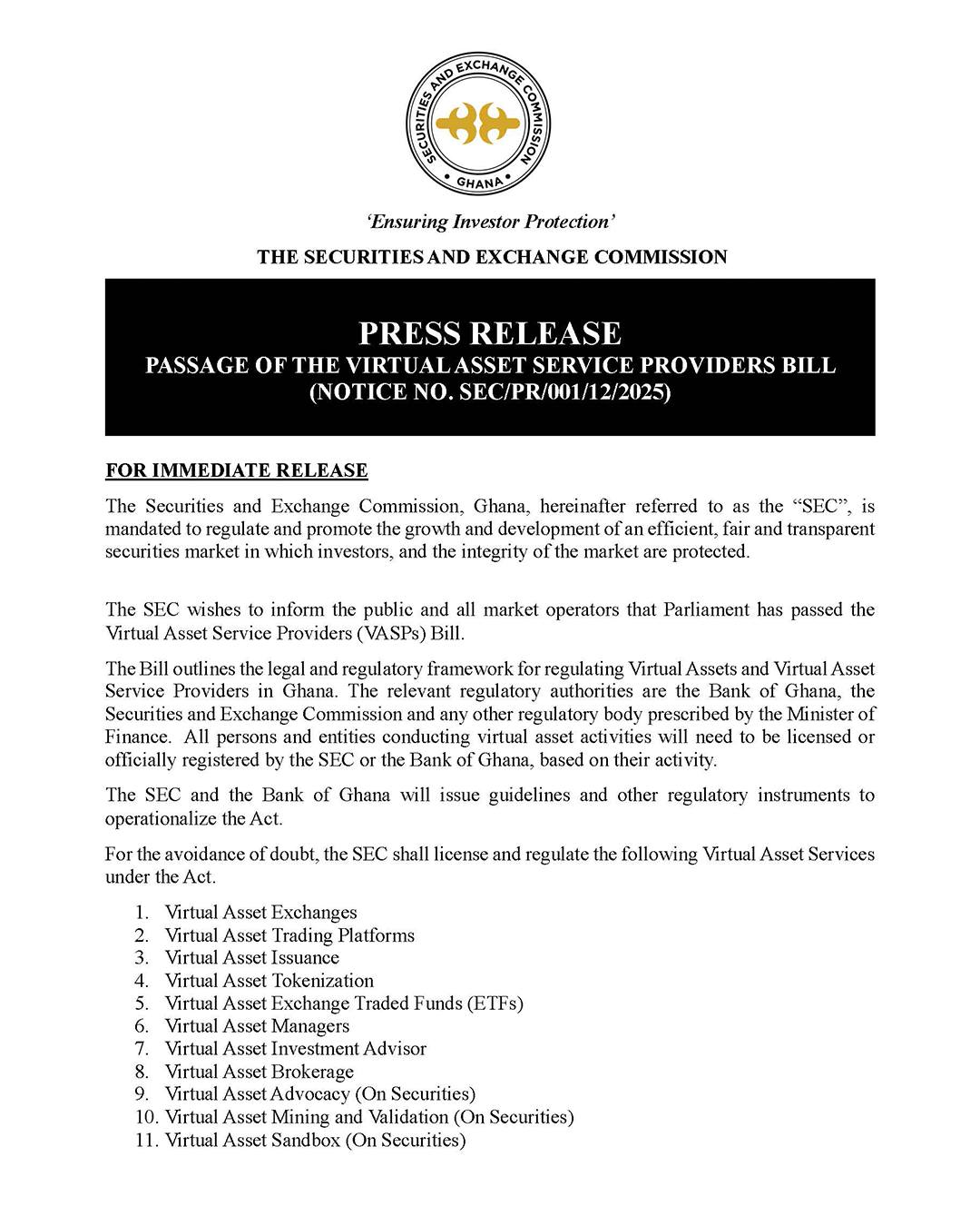 The assent, announced on December 30, 2025, was confirmed by the Deputy Director‑General of the Securities and Exchange Commission (SEC), Mensah Thompson, in a statement shared on social media following Parliament’s approval of the bill after extensive deliberations.