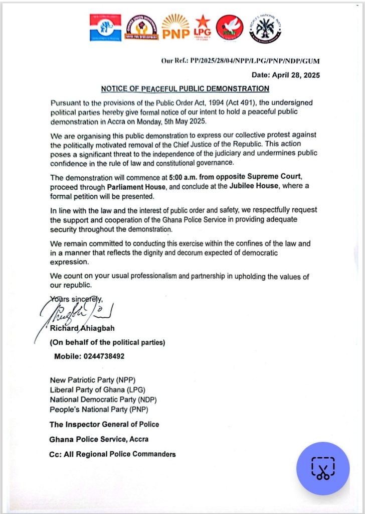A coalition of political parties has officially notified the Ghana Police Service of their intent to stage a peaceful public demonstration on Monday, May 5, 2025, against what they describe as a politically motivated attack on the judiciary. In a notice signed by Richard Ahiagbah on behalf of the participating parties, the New Patriotic Party (NPP), Liberal Party of Ghana (LPG), National Democratic Party (NDP), and People’s National Party (PNP) expressed grave concern over recent actions they claim are aimed at the removal of the Chief Justice of the Republic.
