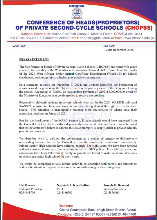 The Conference of Heads of Private Second-Cycle Schools (CHOPSS) has expressed deep concern over the delay in releasing the 2024 West African Senior School Certificate Examination (WASSCE) results for school candidates.