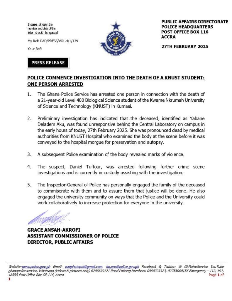 Police in the Ashanti region have arrested a male student of the Kwame Nkrumah University of Science and Technology, KNUST, believed to be the mastermind behind the suspected murder of a final year female student of the school early today, February 27, 2025.