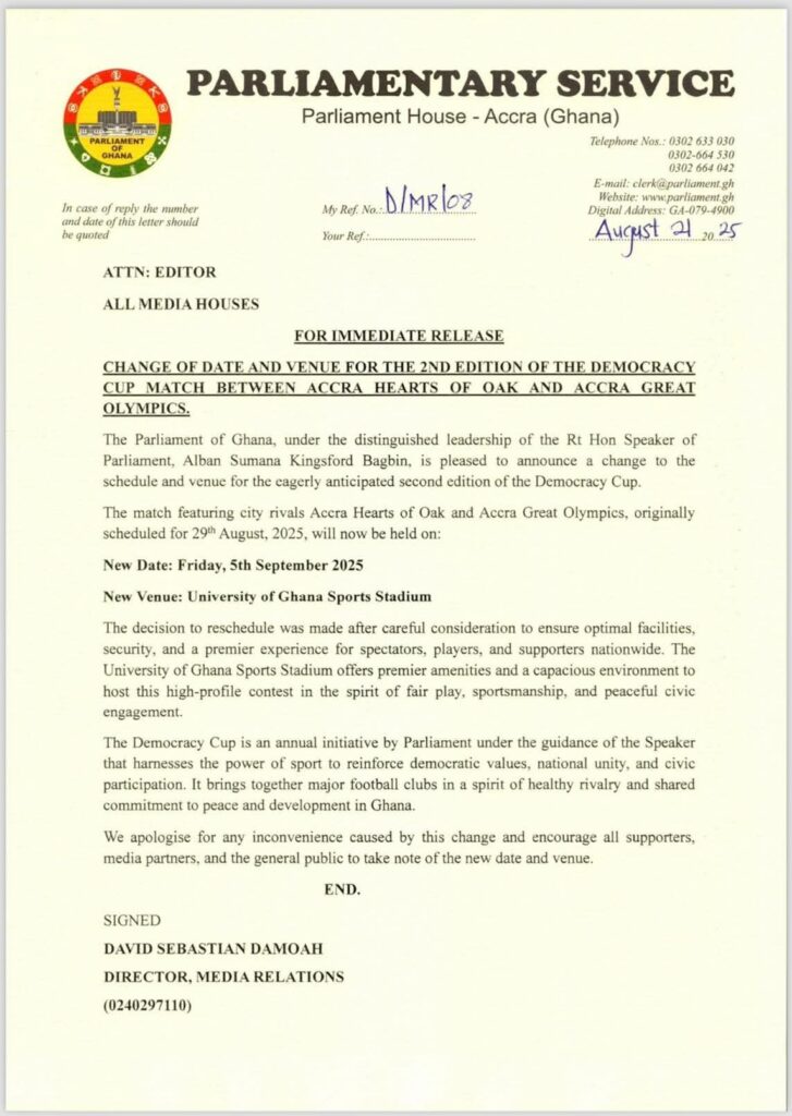 The highly anticipated second edition of the Democracy Cup match between Accra Hearts of Oak and Accra Great Olympics has been rescheduled.