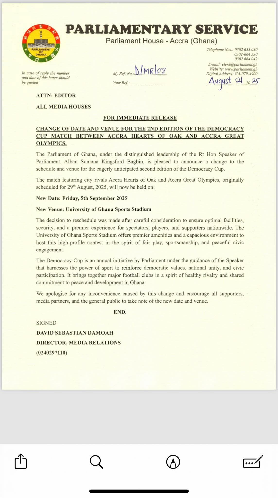The Democracy Cup, introduced by Parliament, is an annual initiative that leverages football’s mass appeal to promote democratic values, civic engagement, and national unity. By bringing together top Ghanaian clubs in a spirit of fair play and healthy competition, the Cup reinforces the role of sport in advancing peace and development.