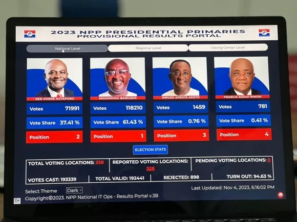 The electioneering process, which started at a rather ambiguous grounds, with political analysts skeptical about the victory of the Vice President on the basis of his track record over the past seven years in power and due to the tribal nature of the NPP populace, the VEEP sailed through with a confident 61.43% which is equivalent to 112, 915 votes cast out of the total votes of 183,631 from the 275 constituencies in the country, over his vicious contender Kennedy Ohene Agyapong with 37.4%, former Agricultural Minister, Dr Afriyie Akoto with 0.75% and Mr Francis Addai-Nimo with 0.41%.
