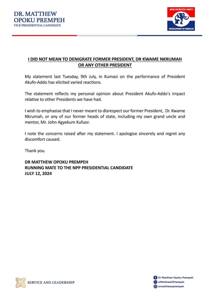 “I wish to emphasize that I never meant to disrespect our former president, Dr. Kwame Nkrumah, or any of our former heads of state; including my grand uncle and mentor, John Agyekum Kufuor. I note the concerns raised after my statement, I apologize sincerely and regret any discomfort caused,” parts of the statement stated.