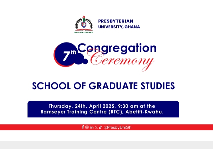 The Seventh Congregation Ceremony of the School of Graduate Studies and Research of the Presbyterian University, Ghana at the Ramseyer Training Centre in Kwahu-Abetifi saw the graduation of 350 students in seven disciplines. These include 26 students graduating with Master of Education in Educational Studies, 39 with MPhil in Educational Studies, 44 with Master of Arts in International Development Studies, 15 with Master of Science in Environmental Health and Sanitation, 10 with Master of Science in Natural Resources Management, 28 with Master of Science in Financial Risk Management, and 188 students graduating with Masters in Public Health.