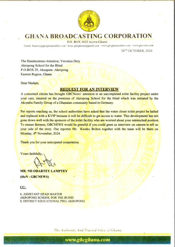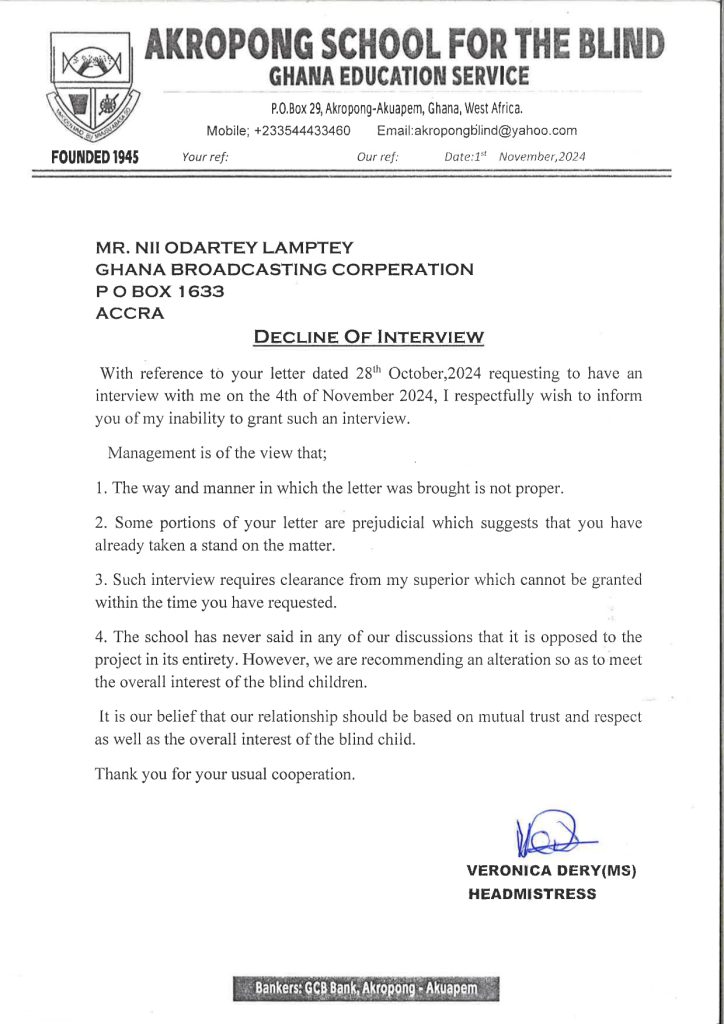 Attached below are copies of the letter sent by GBC News to Madam Veronica Dery, headmistress of the Akropong School for the Blind, and her response.