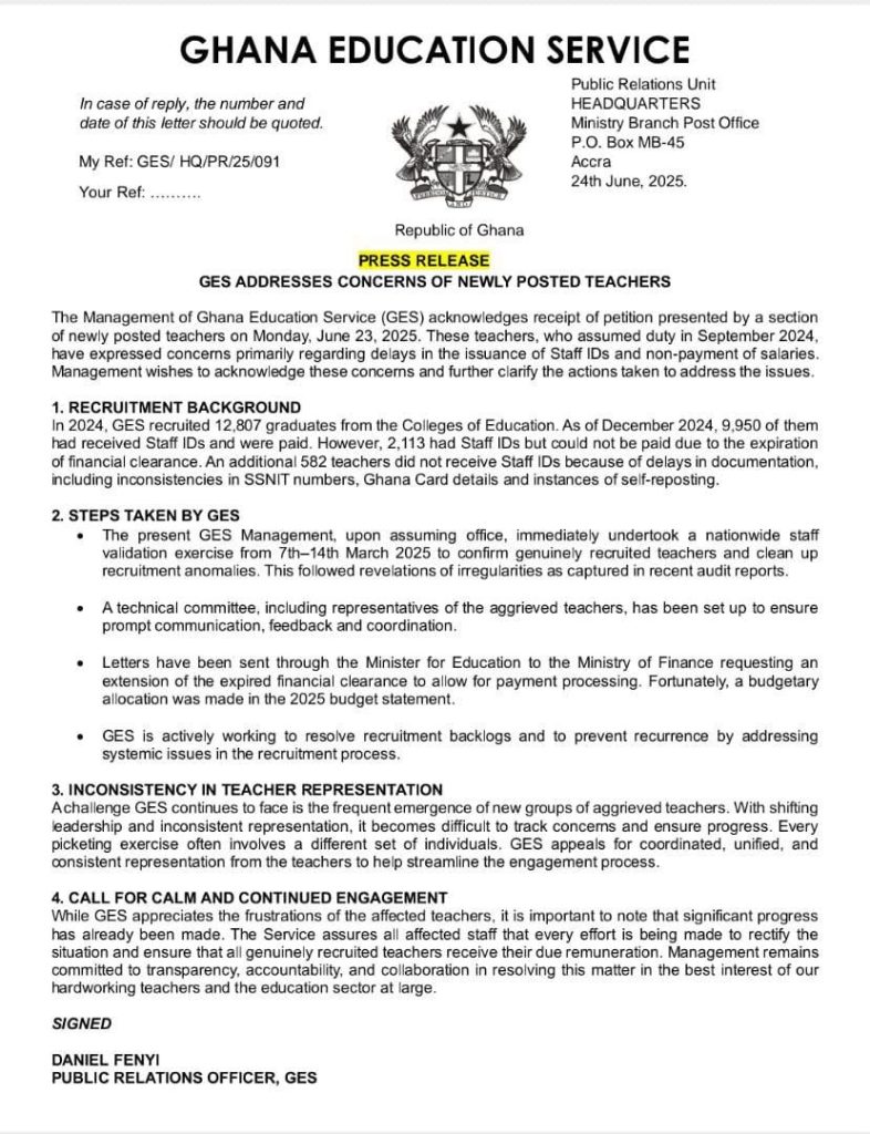 GES, in the statement, sought to address concerns raised by a section of newly posted teachers who submitted a petition at the Service’s headquarters on June 23 2025. The teachers, most of whom have been at post since September 2024, are yet to receive salaries, with many still lacking Staff IDs nearly a year later.
