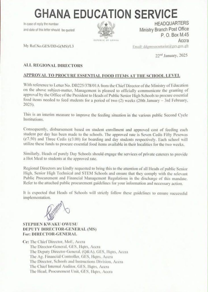 Heads of Public Senior High Schools in Ghana have received approval from the Office of the President to procure essential food items for students for two weeks, from January 20 to February 3, 2025.
