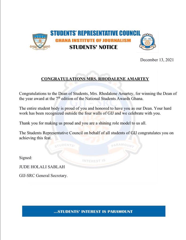 The Dean of Students at the Ghana Institute of Journalism (GIJ), Mrs. Rhodalene Amartey, has been named ”Dean of the Year”, at the 7th Edition of the National Students Awards, Ghana.