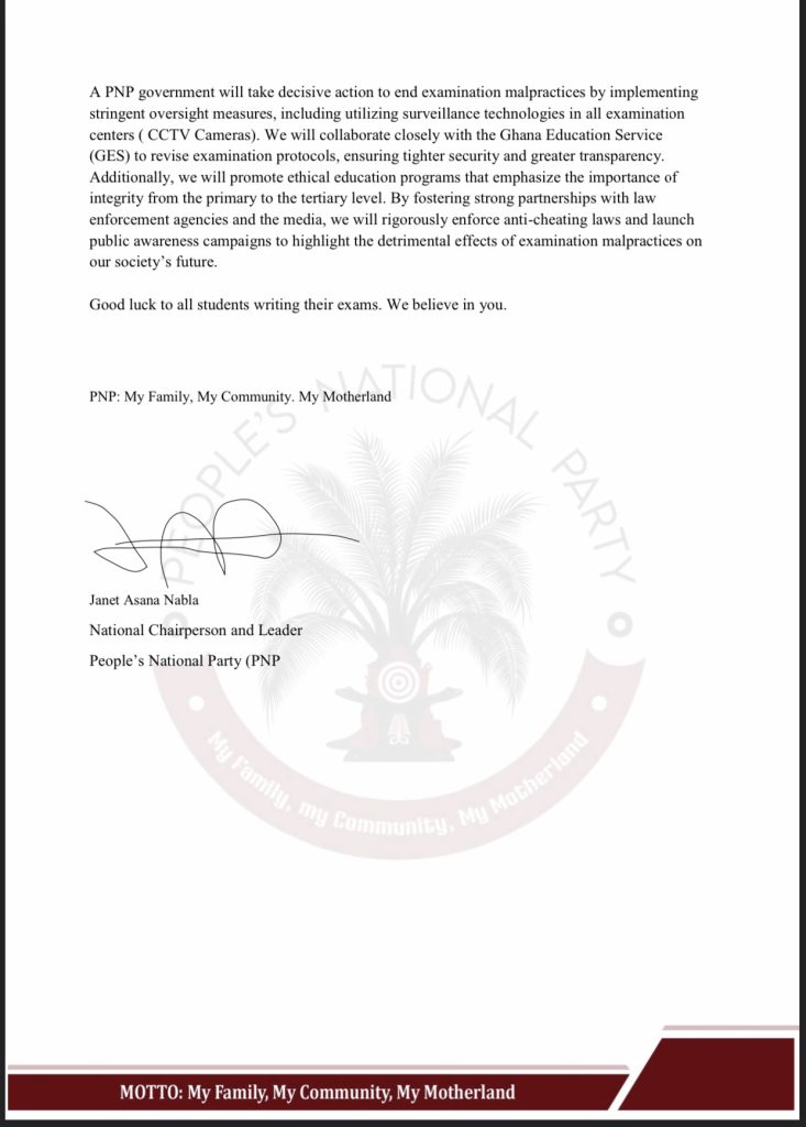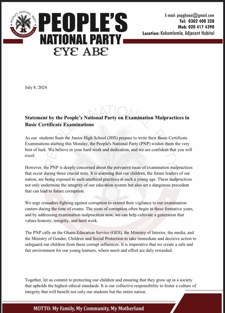 The PNP called on the Ghana Education Service (GES), the Ministry of Interior, the media, and the Ministry of Gender, Children, and Social Protection to take decisive action to prevent cheating and ensure a fair environment for all students.