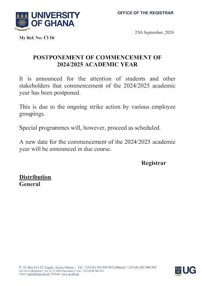 An industrial action by the various teacher unions has forced the management of Ghana’s premier university, the University of Ghana (UG) to postpone the commencement of the 2024/2025 academic year.