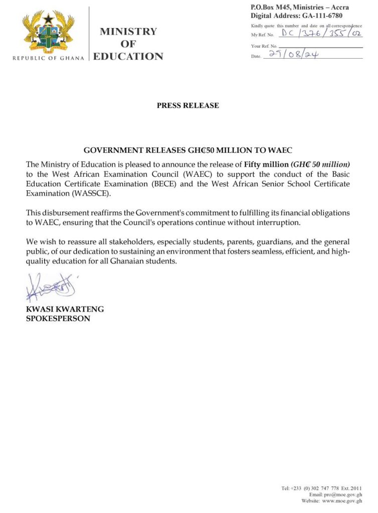 The Government has released GHC50 million to the West African Examinations Council (WAEC) to support the smooth conduct of this year’s Basic Education Certificate Examination (BECE) and West African Senior School Certificate Examination (WASSCE).