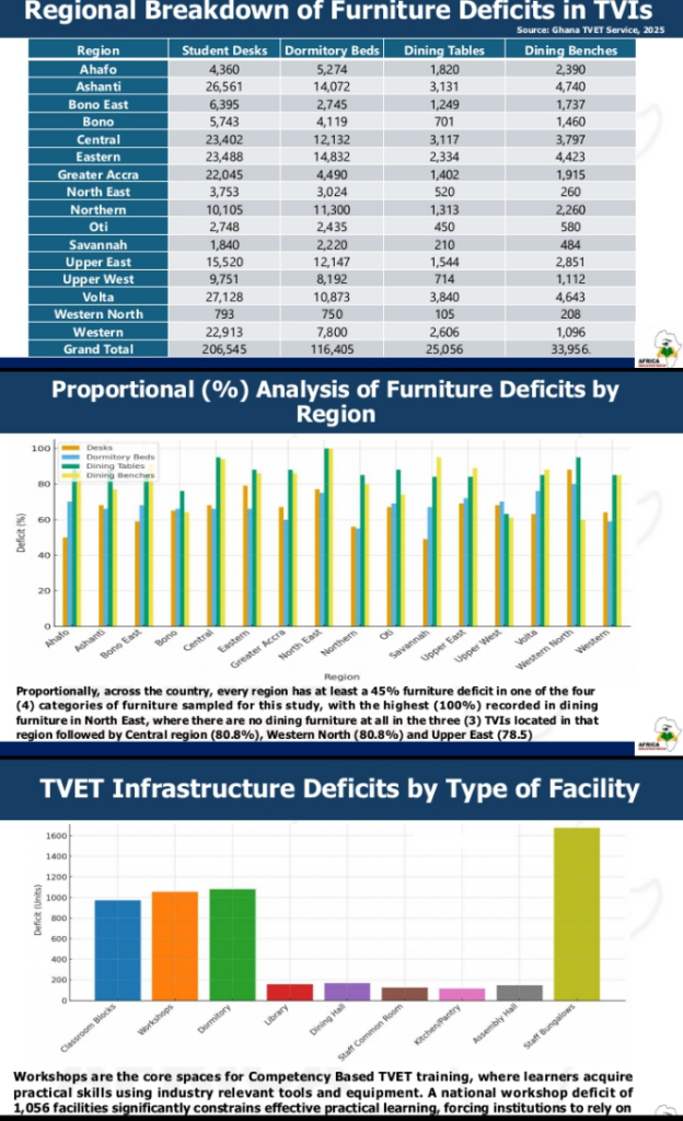 The financing shortfall has also translated into severe infrastructure and furniture deficits across TVIs. Nationally, EduWatch estimates shortages of over 206,000 student desks, 116,000 dormitory beds, and significant gaps in dining furniture. Every region recorded at least a 45 per cent deficit in one category, with the North East Region reporting a 100 per cent shortage in dining furniture in its TVIs.