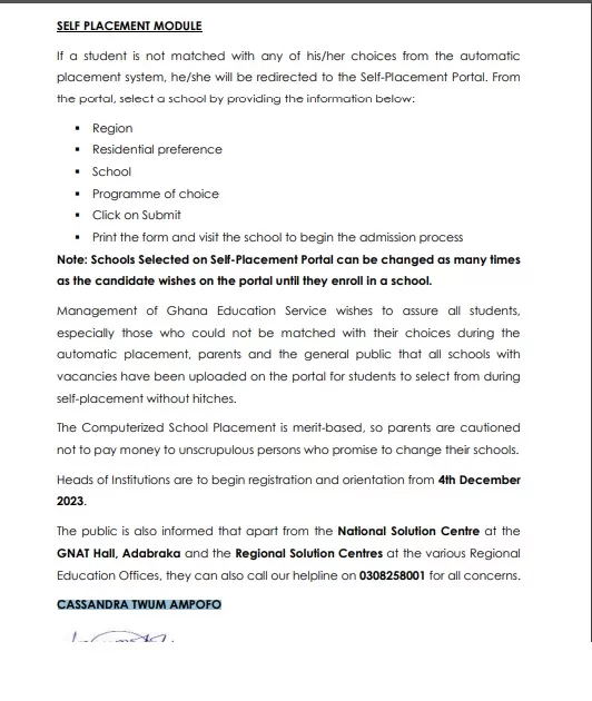 Management of Ghana Education Service wishes to assure all students, especially those who could not be matched with their choices during the automatic placement, parents and the general public that all schools with vacancies have been uploaded on the portal for students to select from during self-placement without hitches.