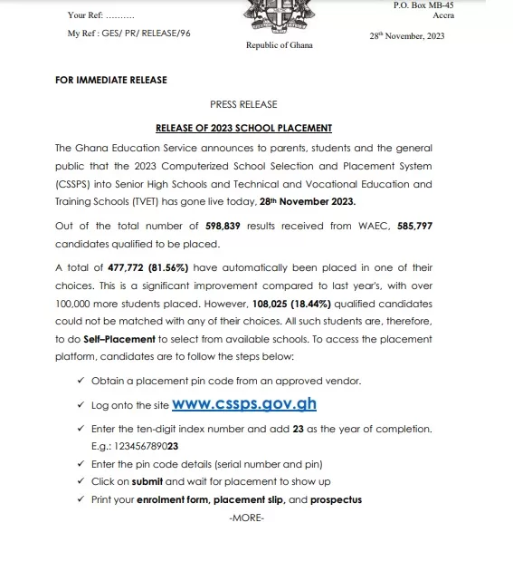 The Ghana Education Service announces to parents, students and the general public that the 2023 Computerized School Selection and Placement System (CSSPS) into Senior High Schools and Technical and Vocational Education and Training Schools (TVET) has gone live today, 28 November 2023.