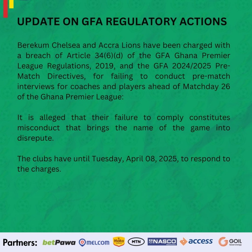 Ghana Football Association (GFA) has officially charged two Premier League clubs, Berekum Chelsea and Accra Lions, for failing to fulfill mandatory pre-match media obligations. The charges stem from the clubs’ failure to conduct pre-match interviews ahead of their highly anticipated Match day 26 encounter.