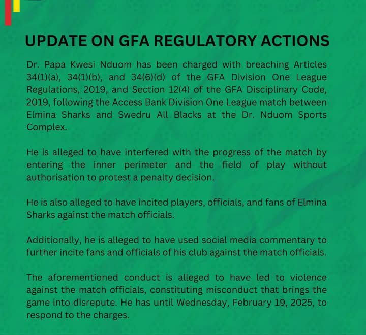 As a result of these allegations, Dr. Nduom now faces serious charges, including breaches of the Division One League Regulations and the GFA Disciplinary Code.