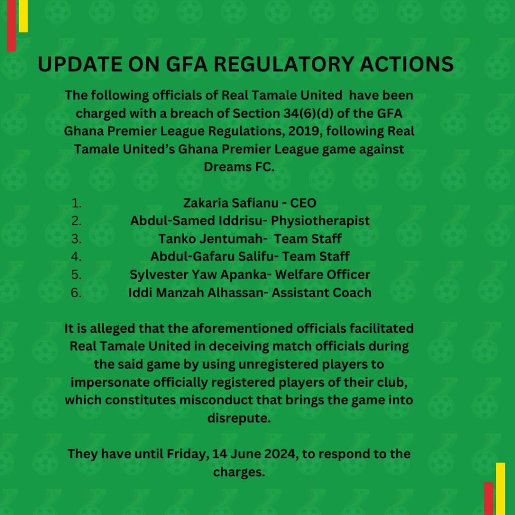The Tamale based team fielded an unregistered players in place of their registered players after they failed to get their players to honour the game. The GFA has since charged some officials of the club including Zakaria Safianu – CEO,