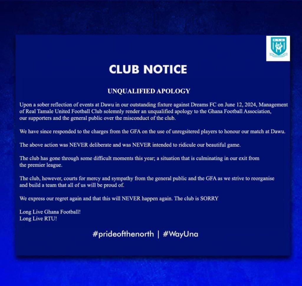 Ghana Premier League side Real Tamale United have rendered apology to the football loving fans of Ghana and the Ghana Football Association for fielding unregistered players in their outstanding game against Dreams FC on June 12, 2024 at the Theatre of Dreams.