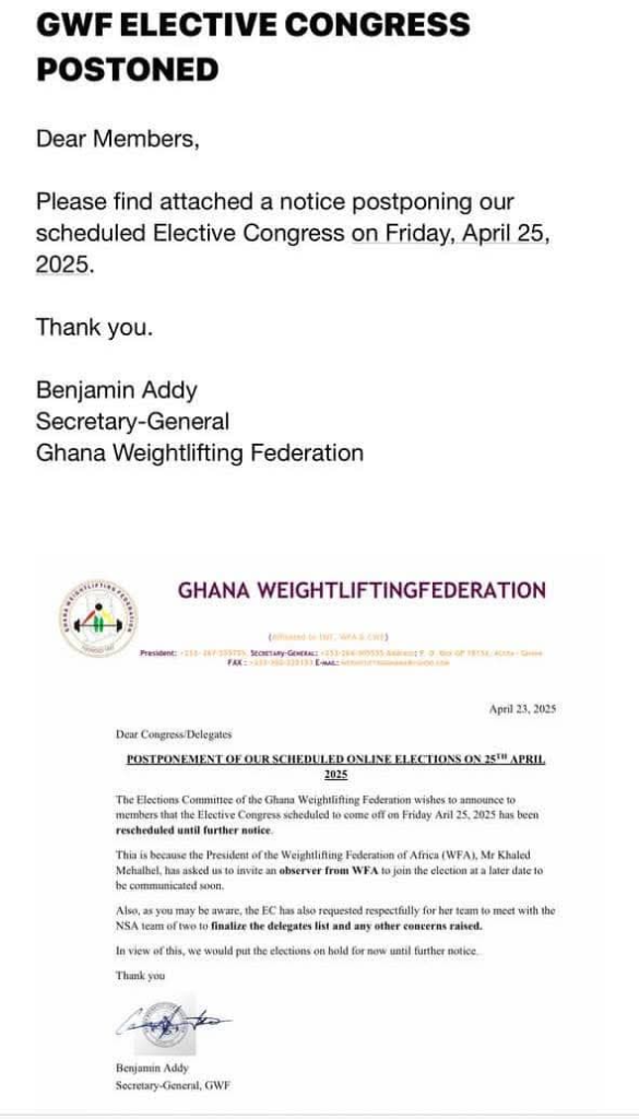 The Ghana Weightlifting Federation (GWF) has announced the postponement of its scheduled Elective Congress, which was set for Friday, April 25, 2025.