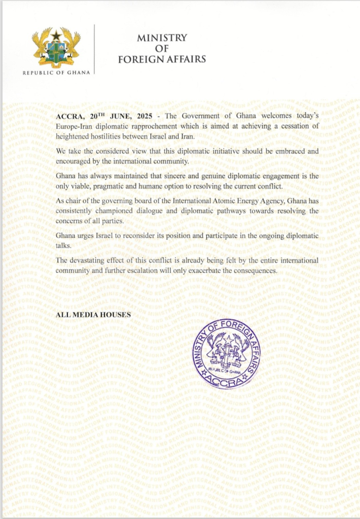 In a statement issued by the Ministry of Foreign Affairs on Friday, June 20, 2025, Ghana called the diplomatic initiative a vital step and encouraged the international community to support the process. The government reaffirmed its long-standing position that sincere and genuine diplomatic engagement is the most viable, pragmatic, and humane approach to resolving conflicts.