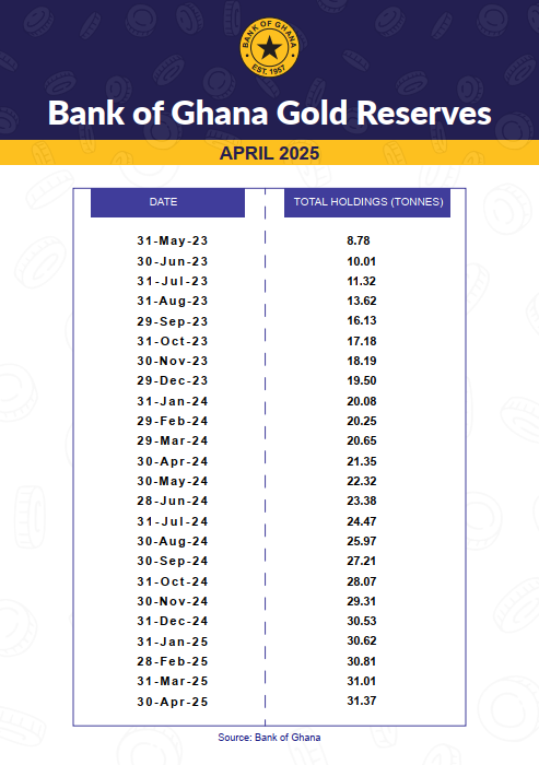 Data from the Bank of Ghana (BoG) indicates a significant rise in the country’s gold reserves as of April 26, 2025. According to the central bank, Ghana’s reserves now stand at 31.37 tonnes, marking a notable increase compared to 8.78 tonnes recorded in May 2023.