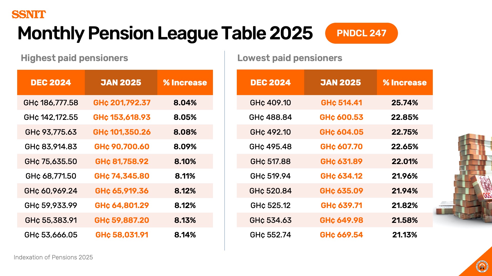 The lowest-paid pensioner moved from GH¢409.10 in December 2024 to GH¢514.41 in January 2025, representing a 25.74% increase.