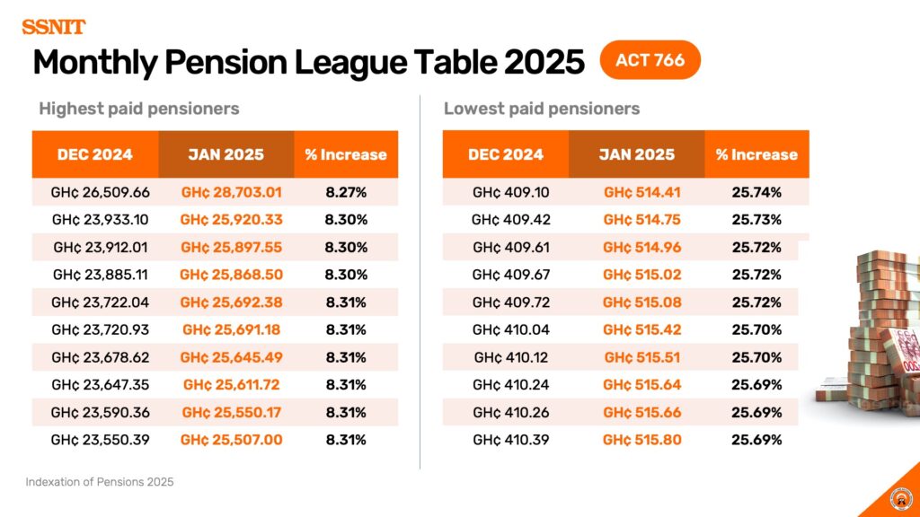 The lowest-paid pensioner moved from GH¢409.10 in December 2024 to GH¢514.41 in January 2025, representing a 25.74% increase.