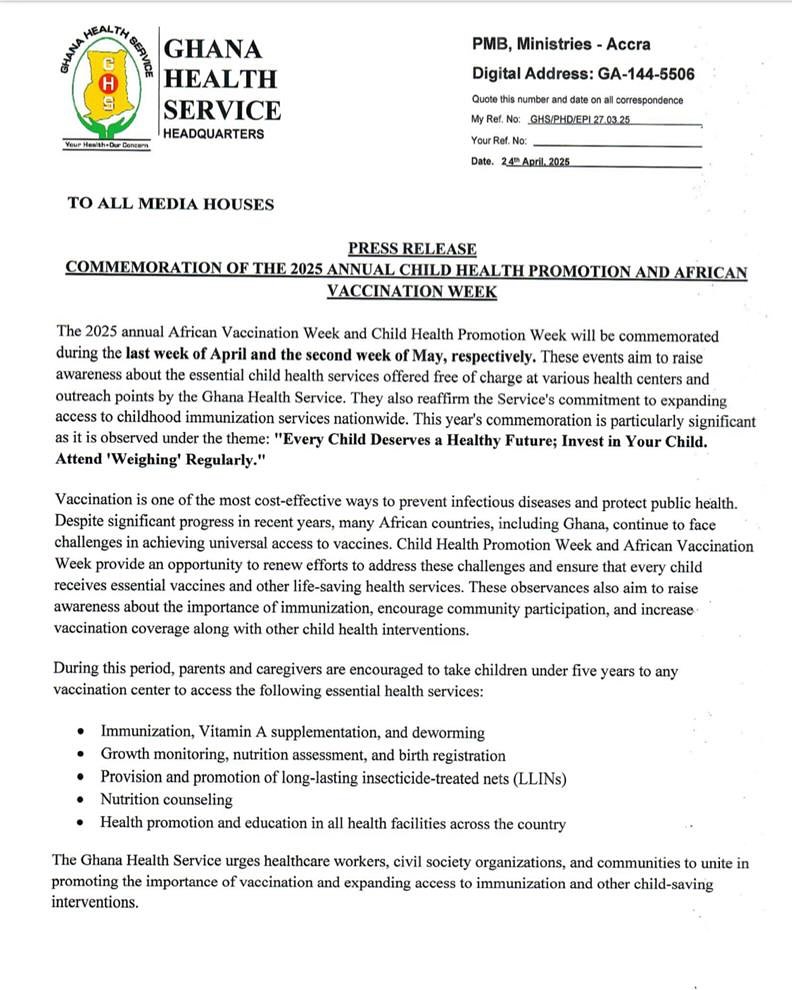 In a press statement released on April 24, 2025, the Ghana Health Service emphasized the critical role vaccination plays in preventing deadly childhood diseases and improving public health.