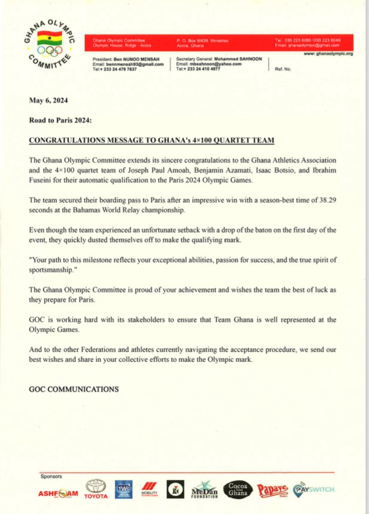Following this incredible milestone set by the team spearheaded by the amazing duo of Ibrahim Fuseini,Isaac Botsio,Benjamin Azamati, and African Games 200m gold medalist Joseph Paul Amoah, the Ghana Olympics Committee has come out to congratulate the athletes for securing qualification to the Olympic Games in Paris.