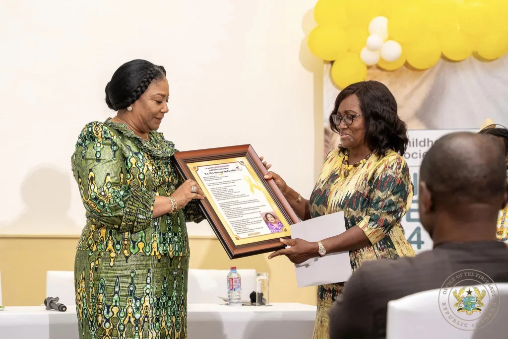 Mrs. Rebecca Akufo-Addo was honored by the Childhood Cancer Society of Ghana (CCSG) for her contribution and dedication to the welfare of children with cancer in the country.