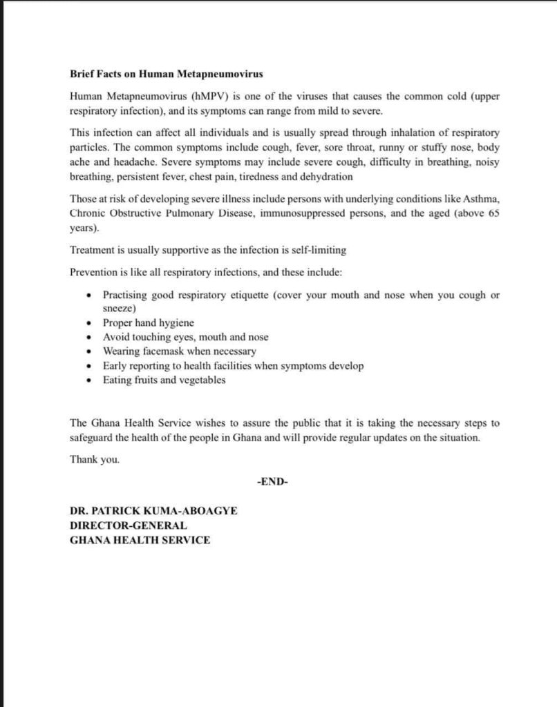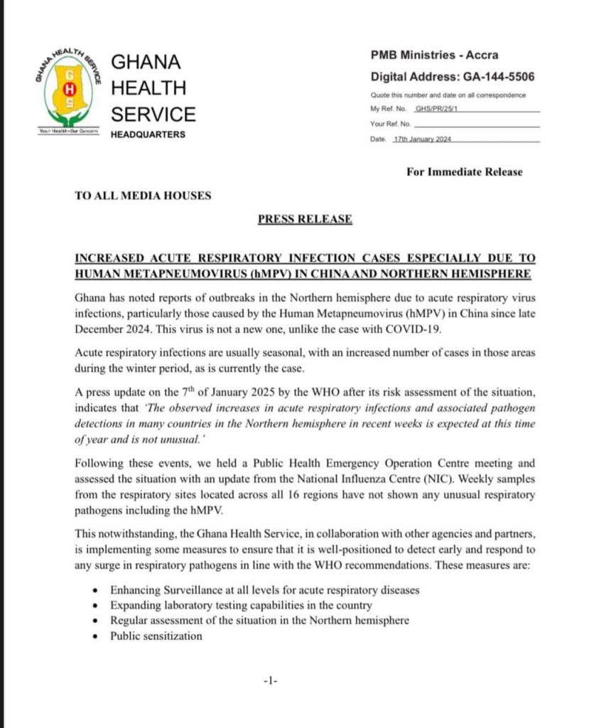 The Ghana Health Service (GHS) has issued a public health alert regarding an increase in acute respiratory infections in the Northern Hemisphere, particularly linked to the Human Metapneumovirus (hMPV) in China.