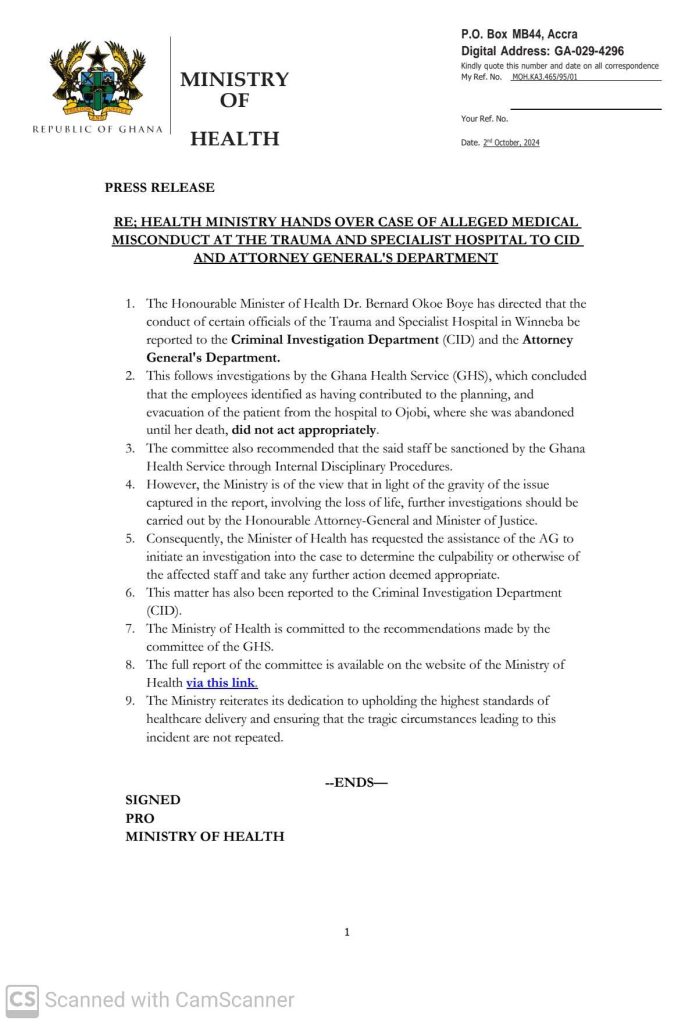 In a statement, the Minister of Health has requested the assistance of the AG to initiate an investigation into the case to determine the culpability or otherwise of the affected staff and take any further action deemed appropriate. This matter has also been reported to the Criminal Investigation Department (CID). The Ministry of Health is committed to the recommendations made by the committee of the GHS.