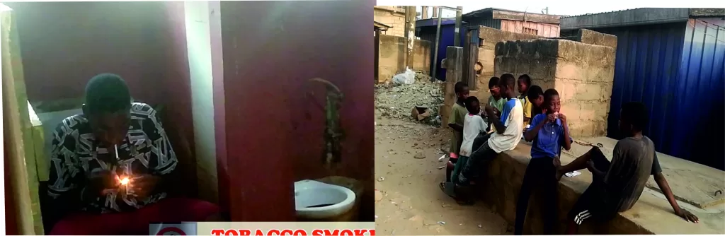 A cursory observation reveals that sometimes some of these children, when playing, use instruments like paper or pieces of sticks to practice smoking. Two of the children, about the age of 8, were caught smoking cigarettes. A 15-year-old boy was also caught smoking in a public toilet.