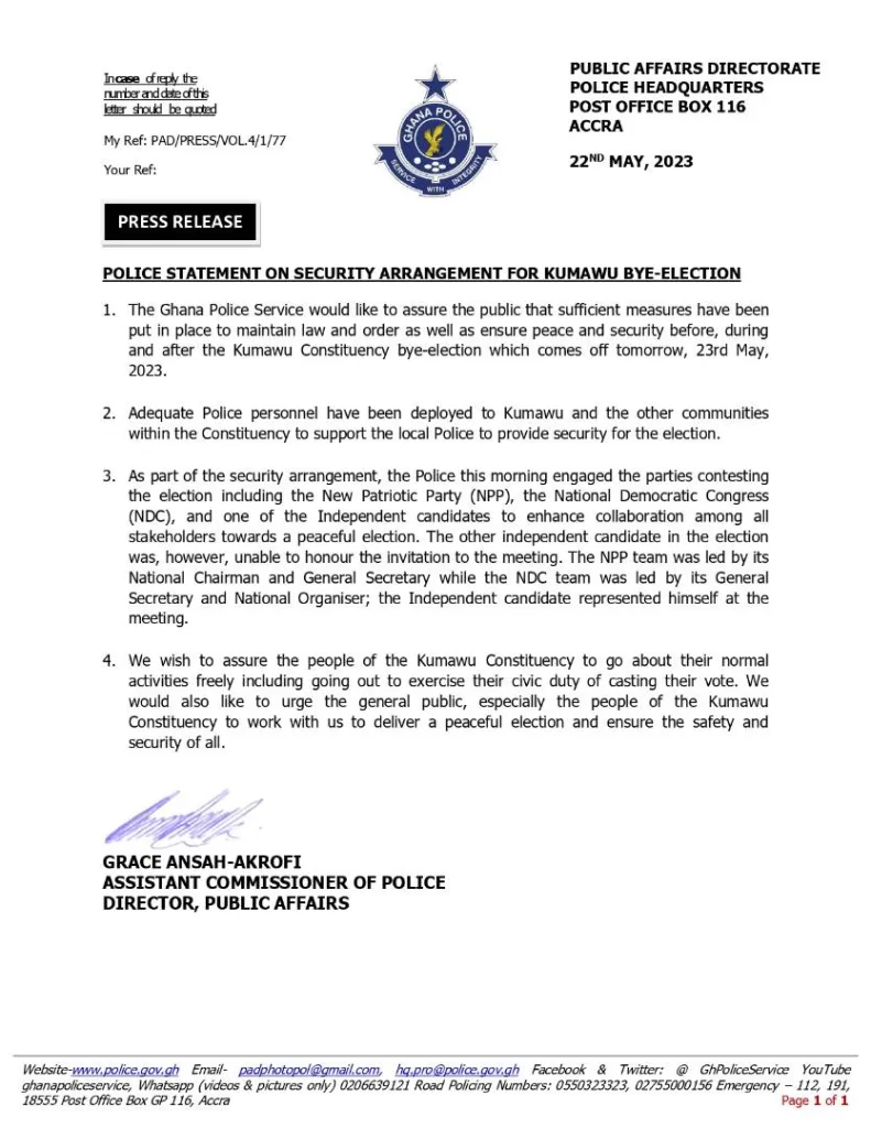 The Ghana Police Service has reassured the public of their commitment to maintaining law and order and ensuring peace and security during the Kumawu Constituency bye-election tomorrow May 23, 2023.