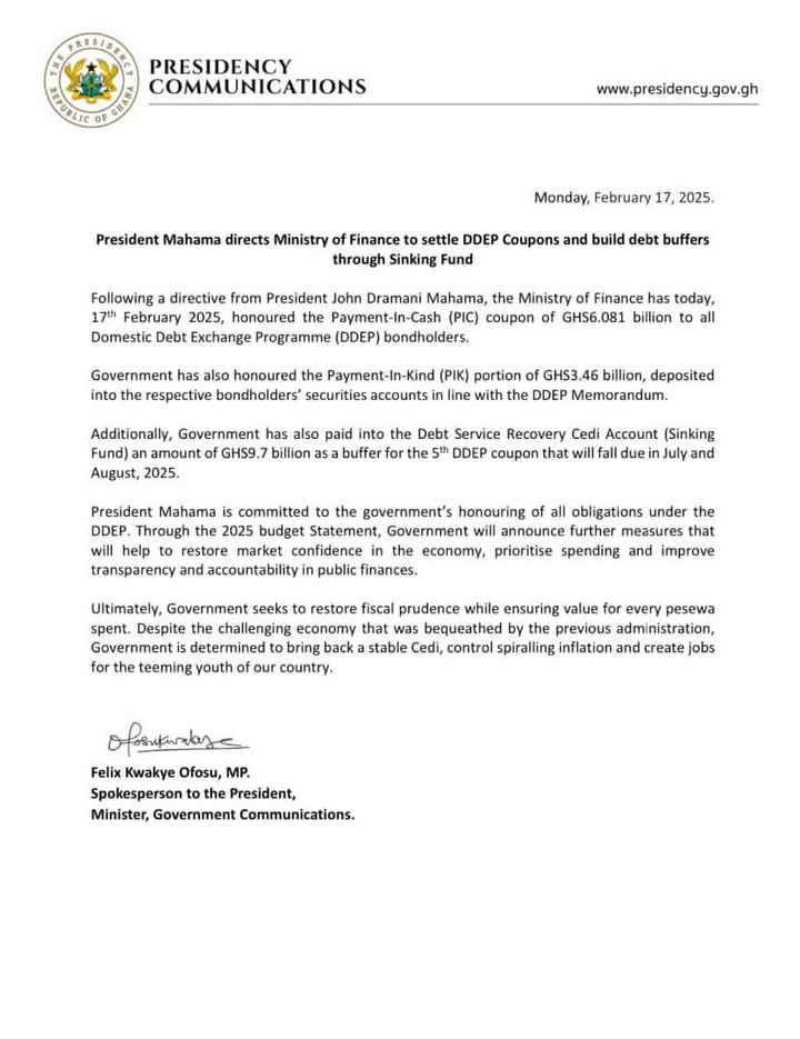President John Dramani Mahama has directed the Ministry of Finance to settle outstanding Domestic Debt Exchange Programme (DDEP) coupons and build a financial buffer through the Sinking Fund.